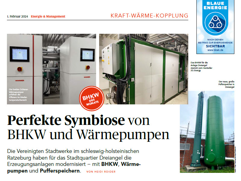 Für das Stadtquartier Dreiangel in Ratzeburg wurde die Erzeugungsanlage modernisiert. Die alte Anlage wurde nach über acht Jahren durch ein neues Biomethan-BHKW der Firma 2G Energy ersetzt. Ergänzt wird das Ganze durch einen Pufferspeicher mit 50.000 Liter Volumen, zwei Wärmepumpen mit je 120 kW Nennleistung und zwei Photovoltaik-Anlagen, welche einzig den Eigenbedarf an Strom für die Wärmepumpen decken. Das BHKW erzeugt im Jahr rund 1.500 MWh Wärme und die Wärmepumpen noch einmal ca. 700 MWh. Damit versorgt die Energiezentrale Dreiangel knapp 200 Haushalte, einen Kindergarten und einen Supermarkt und ist zukünftig darauf ausgelegt, das Fernwärmenetz erweitern zu können.